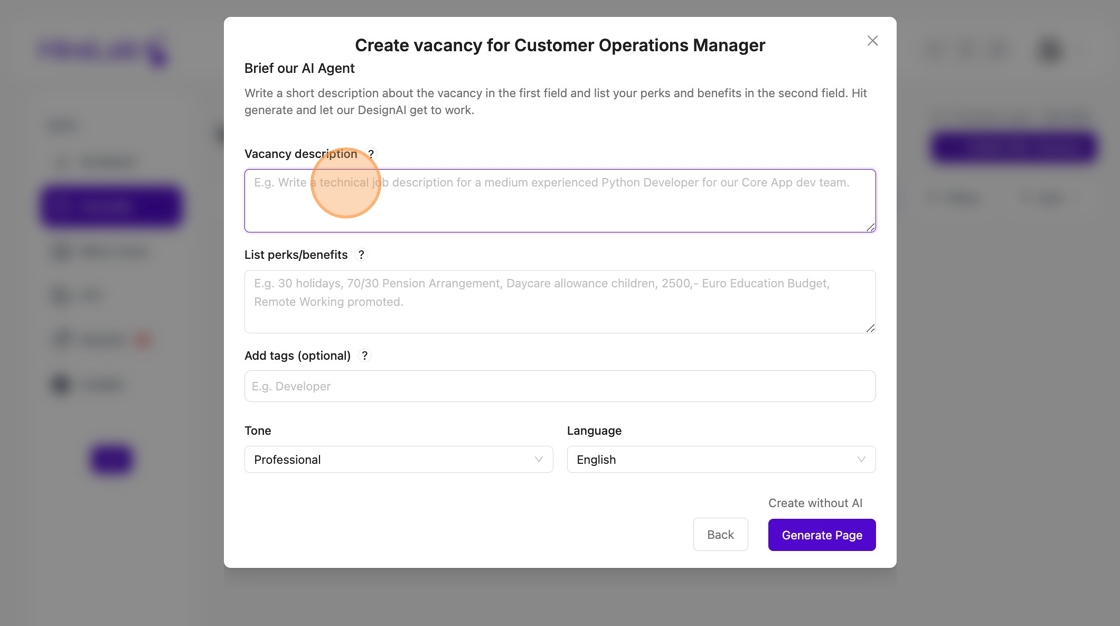4\. Use HireLab AI to write a vacancy for you by filling in the below fields. We recommend keeping the information brief for our system to expand on: “E.g. Write a technical job description for a medium experienced Python Developer for our Core App dev team.”